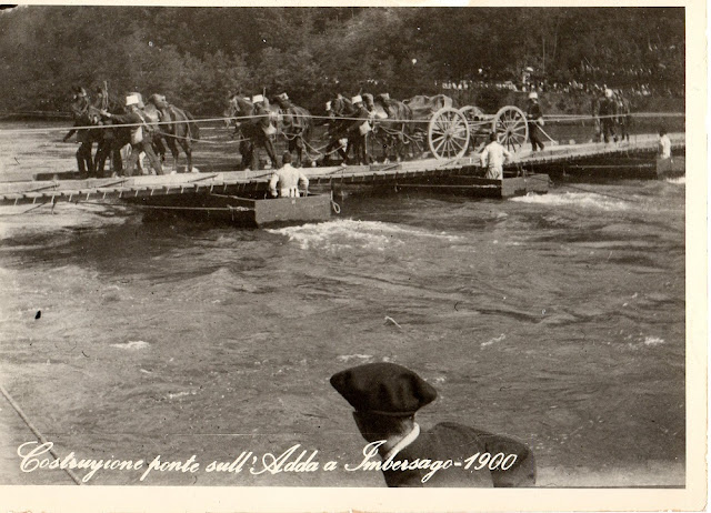 Ho acquistato queste fotografie qualche anno fa al mercatino dell'antiquariato di Imbersago. La didascalia su ognuna delle foto è: "Costruzione ponte sull'Adda a Imbersago - 1900". Successivamente, allo stesso mercatino, ho trovato una copia della terza fotografia in cui è specificato che il ponte fu costruito nel settembre del 1900.